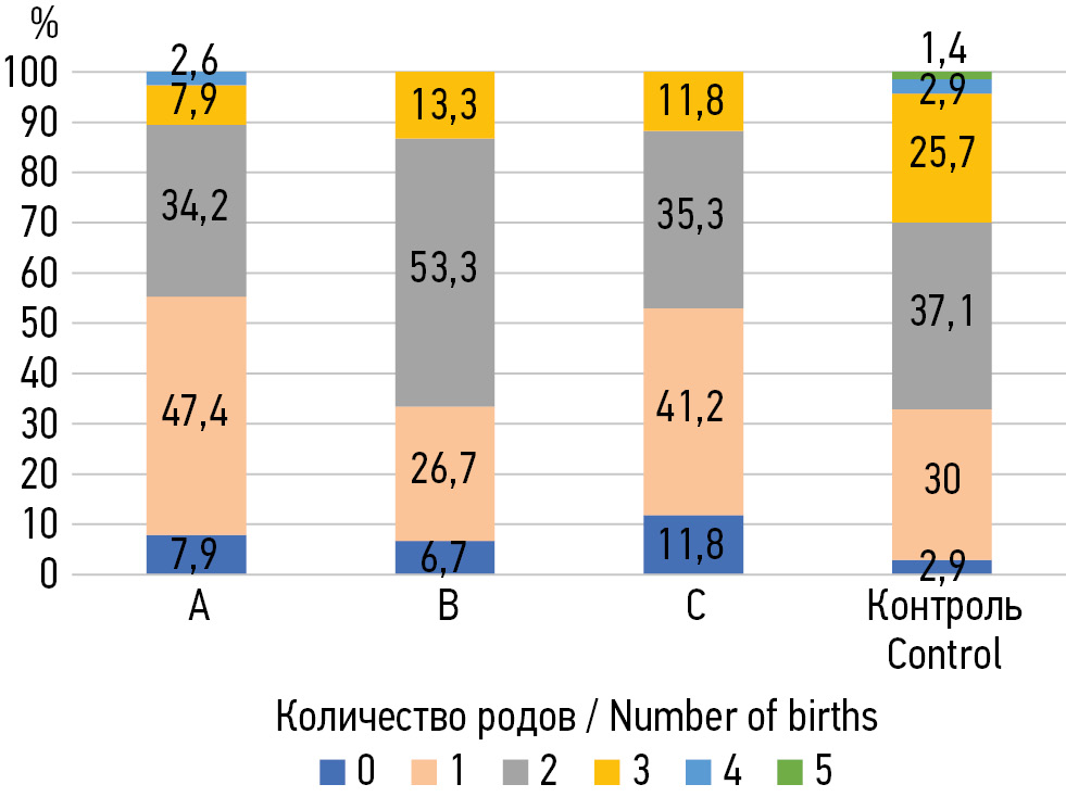 Fig. 7. Distribution of patients of all the study groups by number of births. A, subgroup of women with recurrent forms of pelvic organ prolapse; B, subgroup of women with rare forms of pelvic organ prolapse after extralevatory abdominal-perineal extirpation of the rectum in the anamnesis; C, subgroup of women with complicated forms of pelvic organ prolapse after supravaginal amputation of the uterus with a history of prolapse of the cervical stump