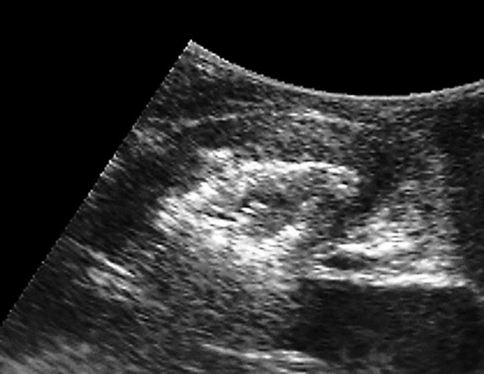 Fig. 1. Echogram of the patient’s symphysis pubis in the sagittal plane.