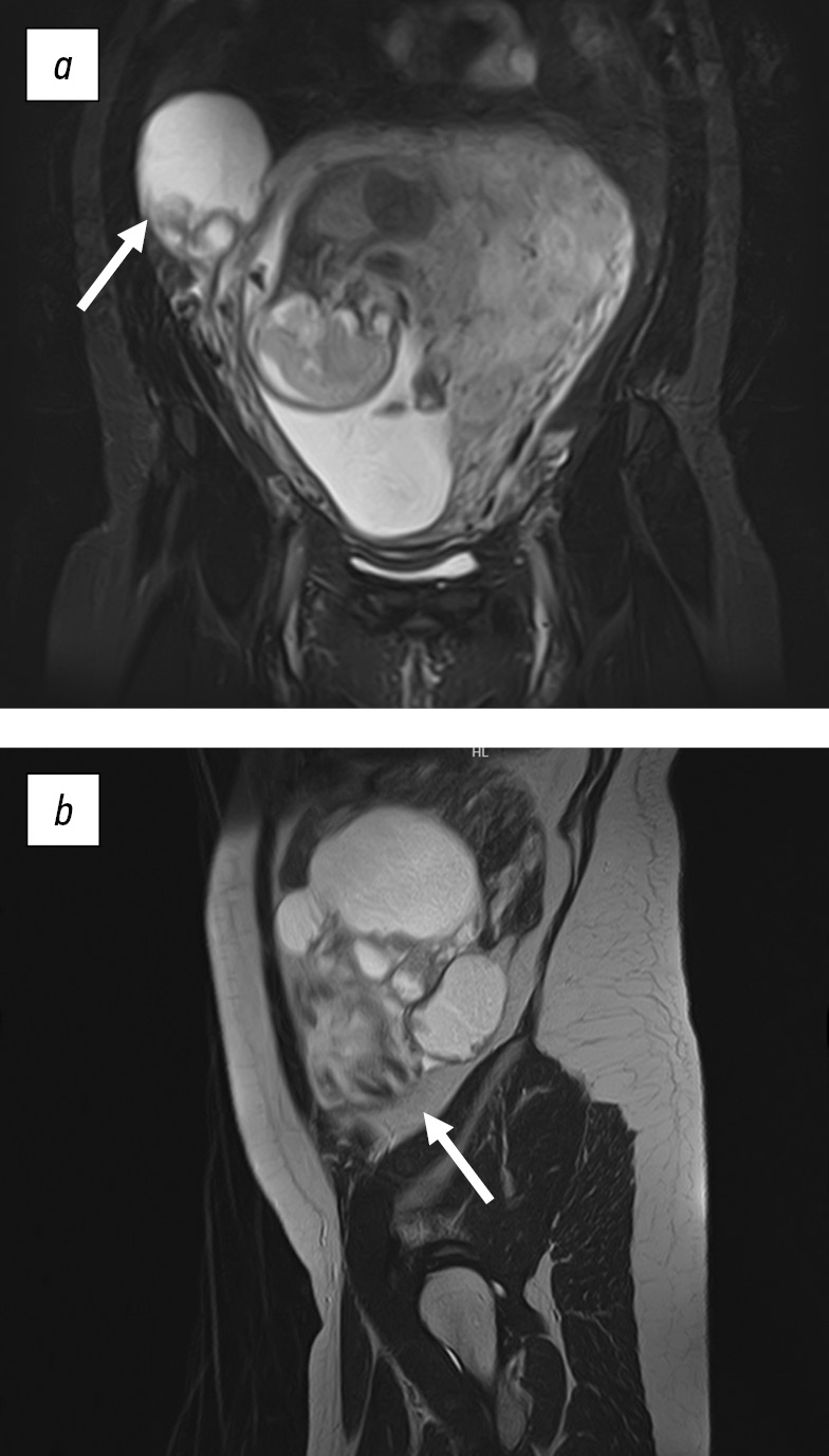 Fig. 1. Magnetic resonance imaging. T2-WI in coronal (a) and sagittal (b) planes showing a cystic-solid formation of the right ovary (arrow)
