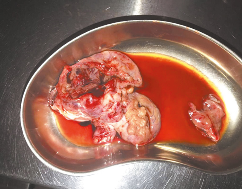 Surgical intervention was performed (November 2019) in the form of diagnostic laparoscopy, conversion laparotomy, adnexectomy on the right, and biopsy of the left fallopian tube, greater omentum, and peritoneum of the right lateral canal (Fig. 2).