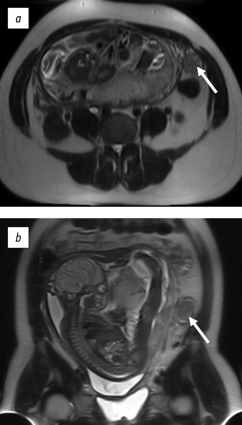 Conclusion indicated pregnancy at week 27; solid neoplasm of the left ovary (39 × 25 × 29 mm); MR presentation without signs of metastatic lesions of the abdominal organs.