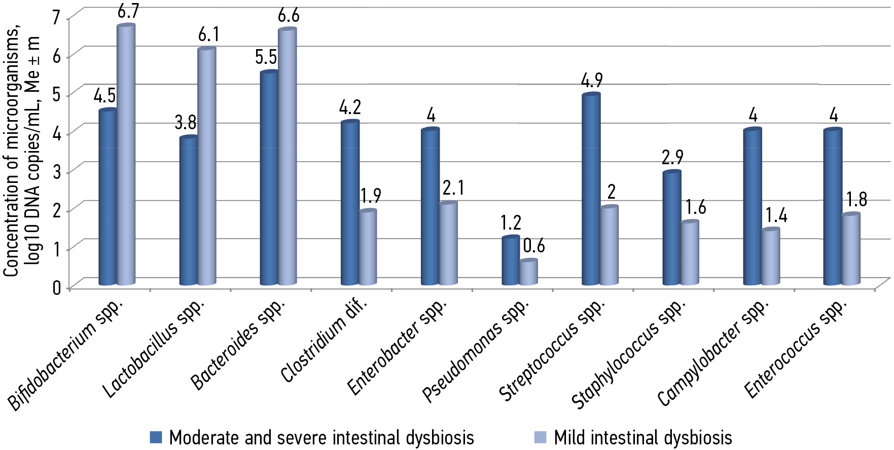 The degree of the intestinal microflora impairment was assessed in accordance with the classification approved by the order of the MH RF dated June 9, 2003, No. 231, considering the data of the working instructions for analysis of the colon microbiota by real-time PCR with fluorescence detection: