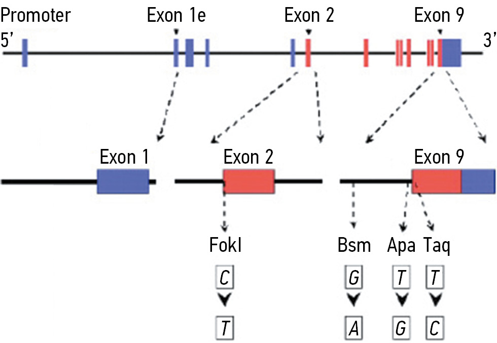 The term “vitamin D” represents a group of chemically similar substances. Contemporary research showed that vitamin D is not only essential for the normal development and functioning of the bone tissue but is also a hormone that causes various changes in many tissues and organs. The active hormonal form of vitamin D, calcitriol (1,25[OH]2D, 1,25-dihydroxy vitamin D, 1,25-dihydroxy vitamin D3) is formed as a result of two successive hydroxylation reactions and binds to specific vitamin D receptors (VDR), with various biological effects, such as hypotensive, lipolytic, normoglycemic, anabolic, antidepressant, analgesic, anti-inflammatory, immunomodulatory, and antiproliferative effects, and also regulates apoptosis and angiogenesis. These effects are classified as “non-classical.” The VDR is encoded by the VDR gene, which has several polymorphic variants. The most significant and studied polymorphic variants of the VDR gene associated with several disease deve lopment are rs1544410 (BsmI), rs2228570 (FokI), rs731236 (TaqI), and rs7975232 (ApaI) [1] (Figure).
