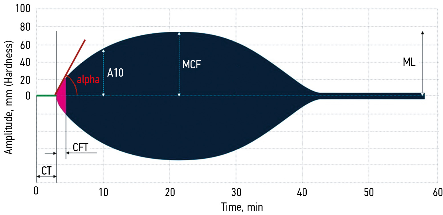 Note. CT — time of clot formation onset; alpha angle — coagulation dynamics; MCF — maximum clot firmness; A10 and A20 — amplitude of the formed clot after 10 and 20 mins, respectively; CFT — clot formation time; EXTEM — thrombus formation via extrinsic coagulation pathway factors; INTEM — thrombus formation via intrinsic coagulation pathway factors.