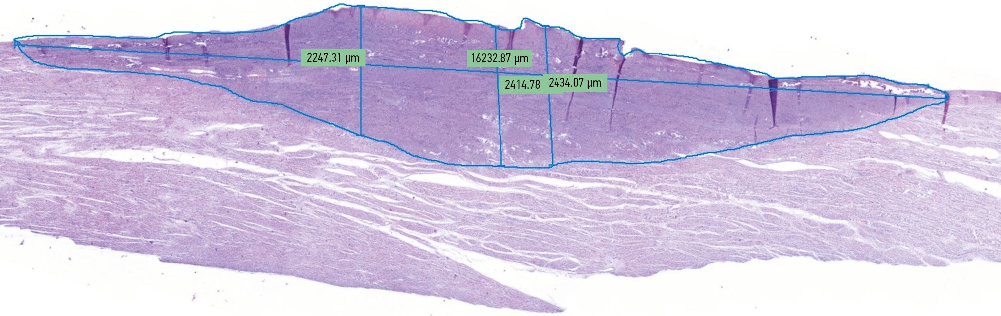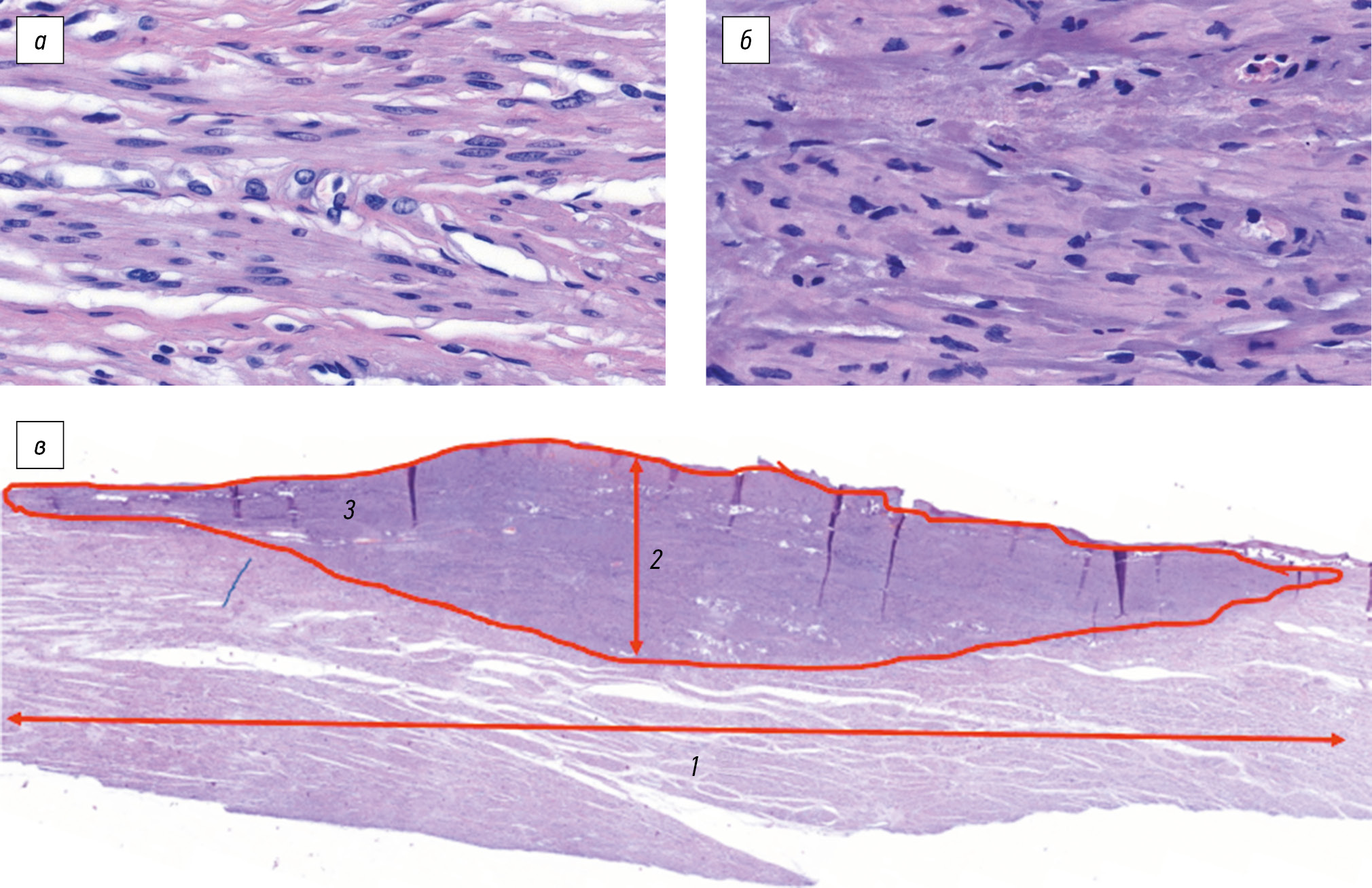 Methods for obtaining and assessing biopsy specimens. Fragments of the uterine body wall sized 2 × 3 cm were excised from the most visually changed areas following damage after exposure to bipolar clamps of various electrosurgical generators. Tissue fragments were fixed in 10% buffered formalin and were subjected to standard processing using a Thermo Scientific Excelsior AS processor (Thermo Shandon Limited, UK). Then, the fragments were embedded in paraffin and cut into 3–3.5-µm thick section. These sections were then stained with hematoxylin and eosin and scanned using a Pannoramic Midi digital scanner (3DHISTECH Kft., Hungary). Subsequently, we performed a morphological assessment of the damaged areas showing signs of irreversible tissue destruction (muscle fibers and other histological structures with sharply disturbed histoarchitectonics, with karyopyknosis, and nuclear hyperchromia, with the destruction and basophilia of the cytoplasm) using the digitized preparations (Fig. 1, a, b). Using the QuantCenter software, a morphometric assessment was performed by measuring three indicators: the prevalence of coagulation effect (mm), the depth of coagulation effect in the three deepest destruction areas with the average value (mm), and the area of coagulation effect (mm2) (Fig. 1, c).