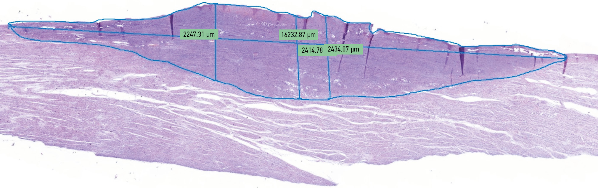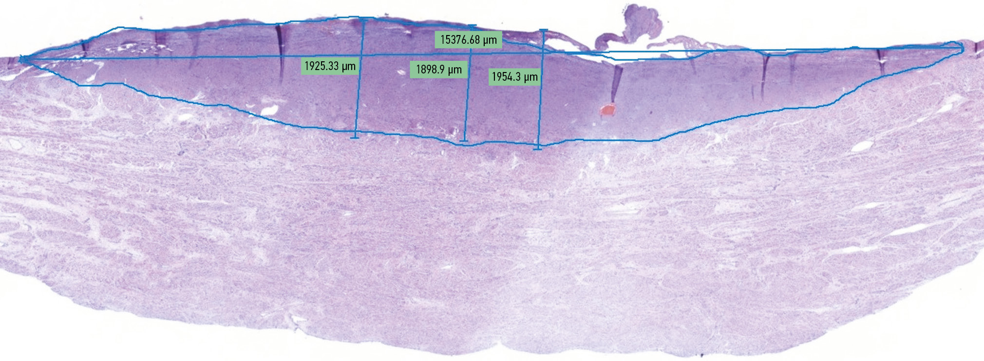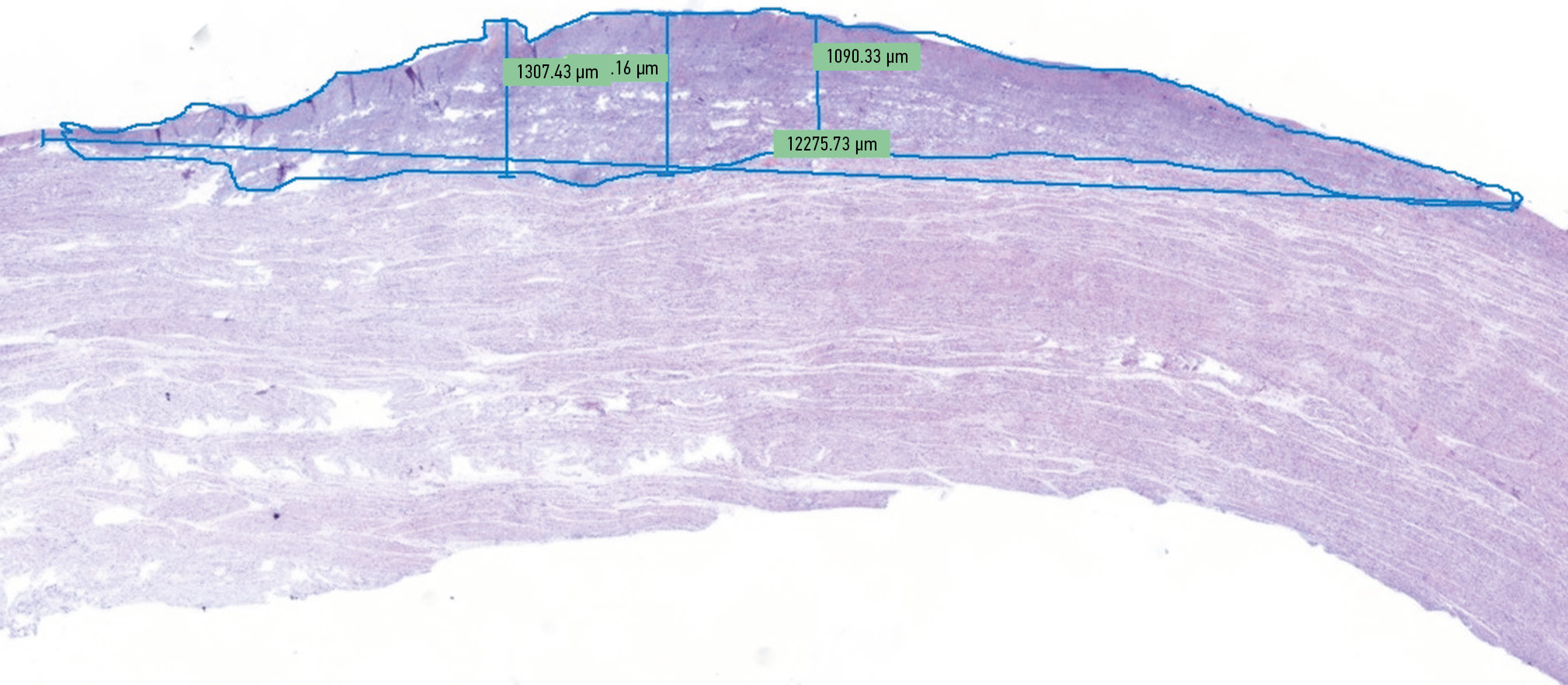 When using the BiClamp® instrument, the maximum temperature used for achieving effective hemostasis during coagulation was 112.29°C and the minimum temperature was 36.13°C; the tissue temperature at the coagulation border was 71.78°C, the depth of coagulation effect on the tissue was 3.54 mm, the area of coagulation distribution was 22.80 mm2, and the prevalence of coagulation was 10.84 mm. Figure 2 shows the morphometric characteristics, namely prevalence (mm), depth (mm), and area (mm2).