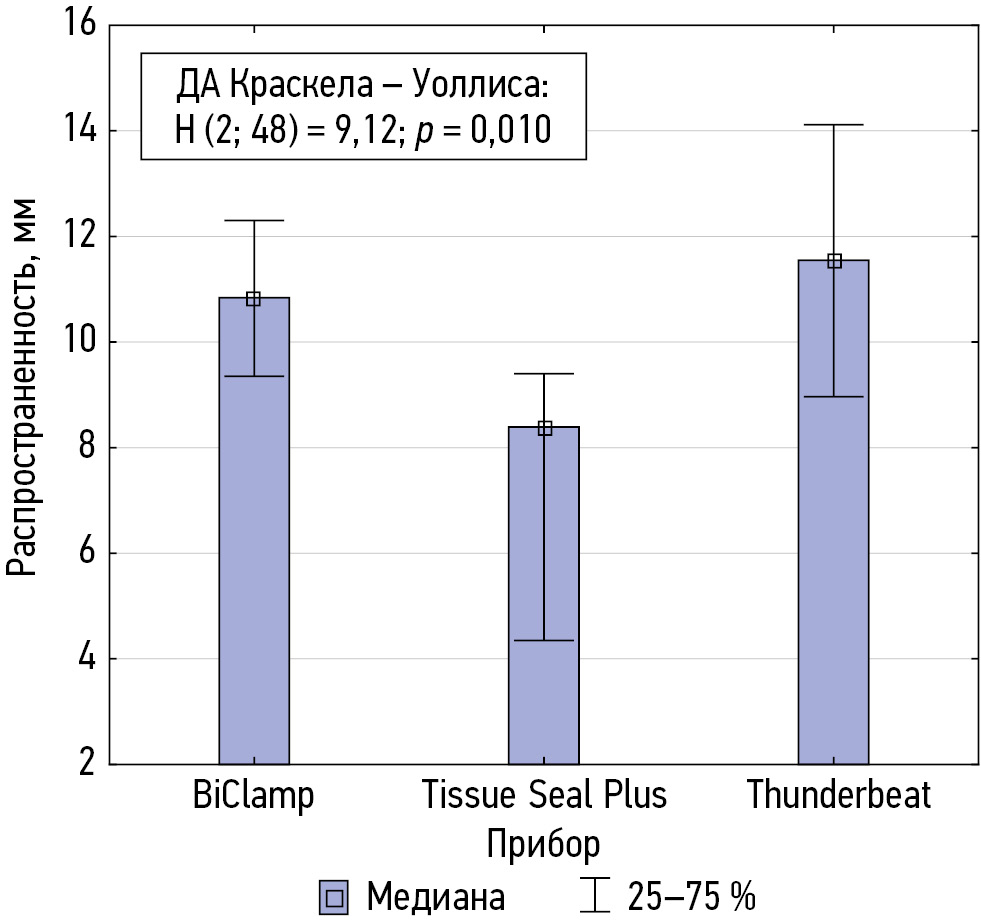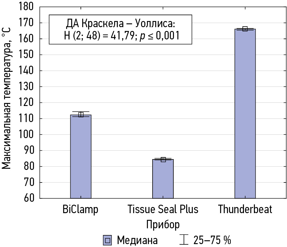 Maximum temperature of the tissue, °С | 112.29 [111.25; 114.40 | 84.45 [84.12; 85.13 | 166.11 [165.40; 166.50] | 41.80 | <0.001 |