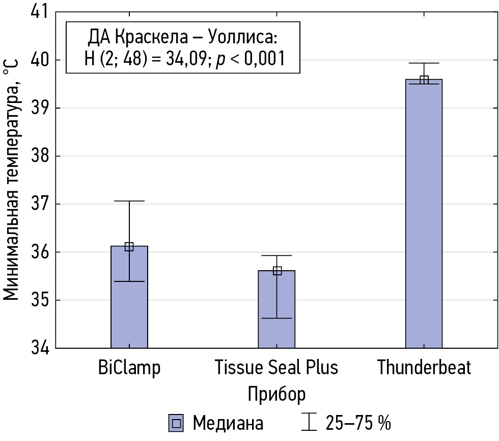 Minimum temperature of the tissue, °С | 36.13 [35.39; 37.07] | 35.62 [34.63; 35.93 | 39.60 [39.50; 39.94] | 34.09 | <0.001 |