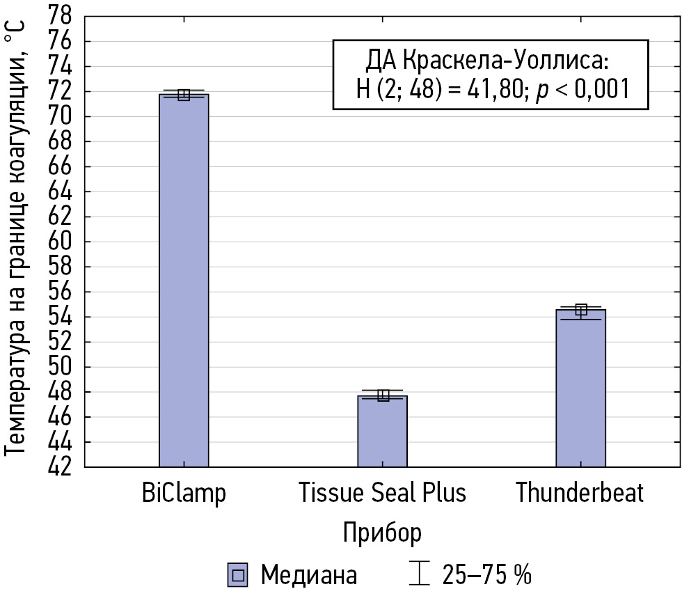 Tissue temperature at the coagulation border, °С | 71.78 [71.55; 72.12] | 47.70 [47.46; 48.15] | 54.57 [53.80; 54.81] | 41.80 | <0.001 |