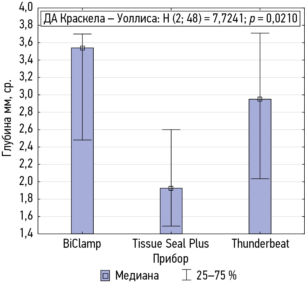Depth, mm, av. (Me [Q1; Q3]) | 3.54 [2.48; 3.70] | 1.93 [1.49; 2.60] | 2.95 [2.04; 3.71] | 7.72 | 0.021 |
