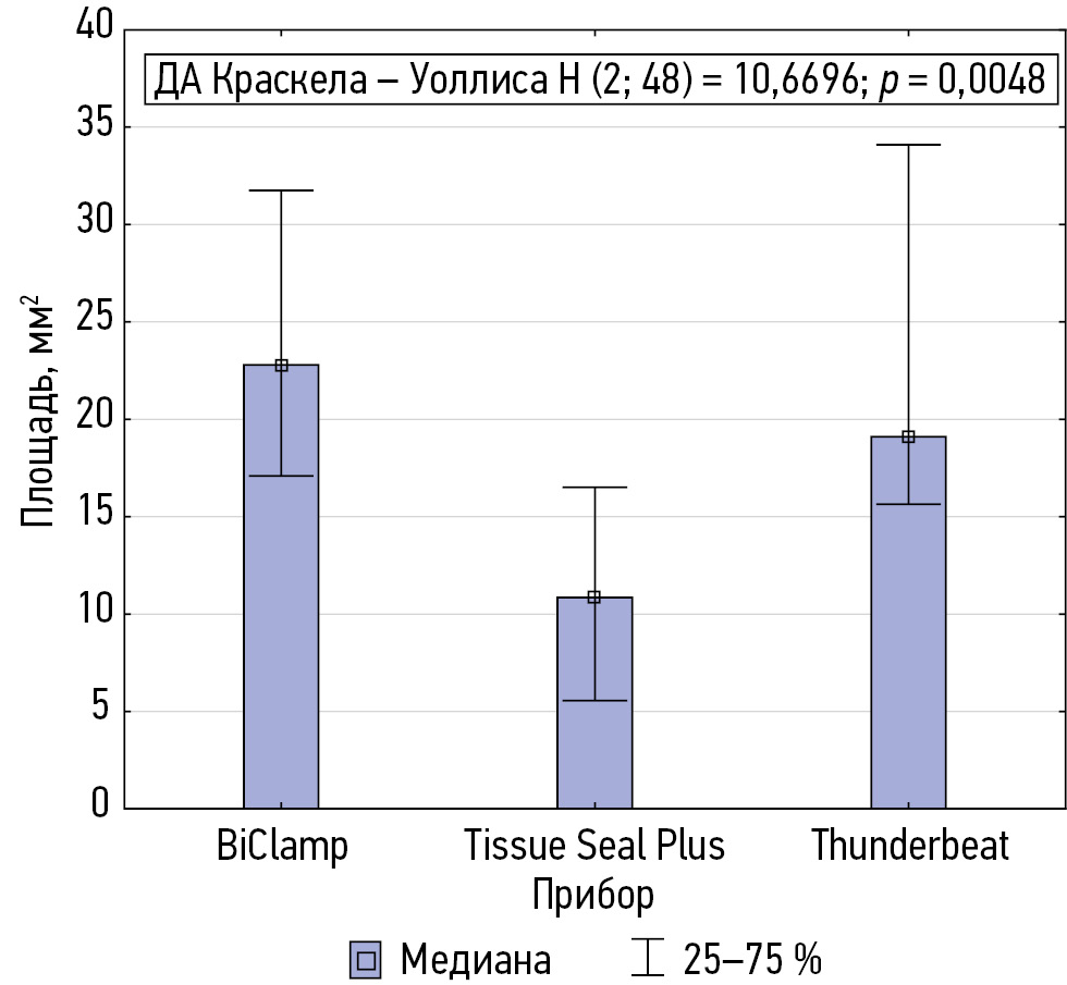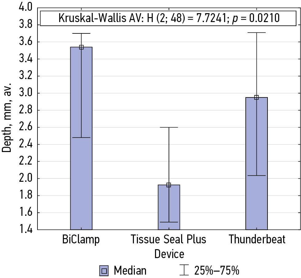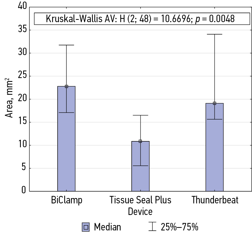 The smallest depth of coagulation effect was recorded when using Tissue Seal Plus® clamps (1.93 mm); when using the BiClamp® and Thunderbeat® clamps, the depths were 3.54 and 2.95 mm, respectively. The area of coagulation prevalence was also the smallest when using the Tissue Seal Plus® (10.85 mm2), and it was 22.80 mm2 with BiClamp® and 19.10 mm2 with Thunderbeat®. The prevalence of coagulation was minimal with Tissue Seal Plus® (8.39 mm), and with BiClamp® and Thunderbeat®, it was 10.84 mm and 11.55 mm, respectively. Figures 8–10 show the prevalence, depth, and area of exposure to coagulation.