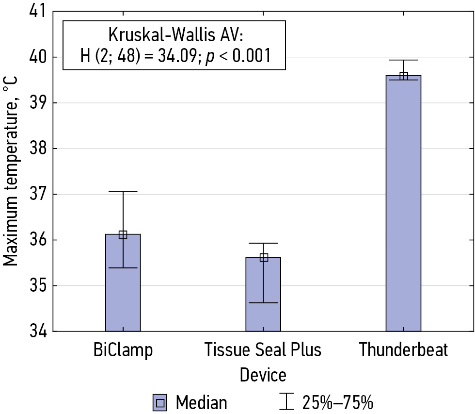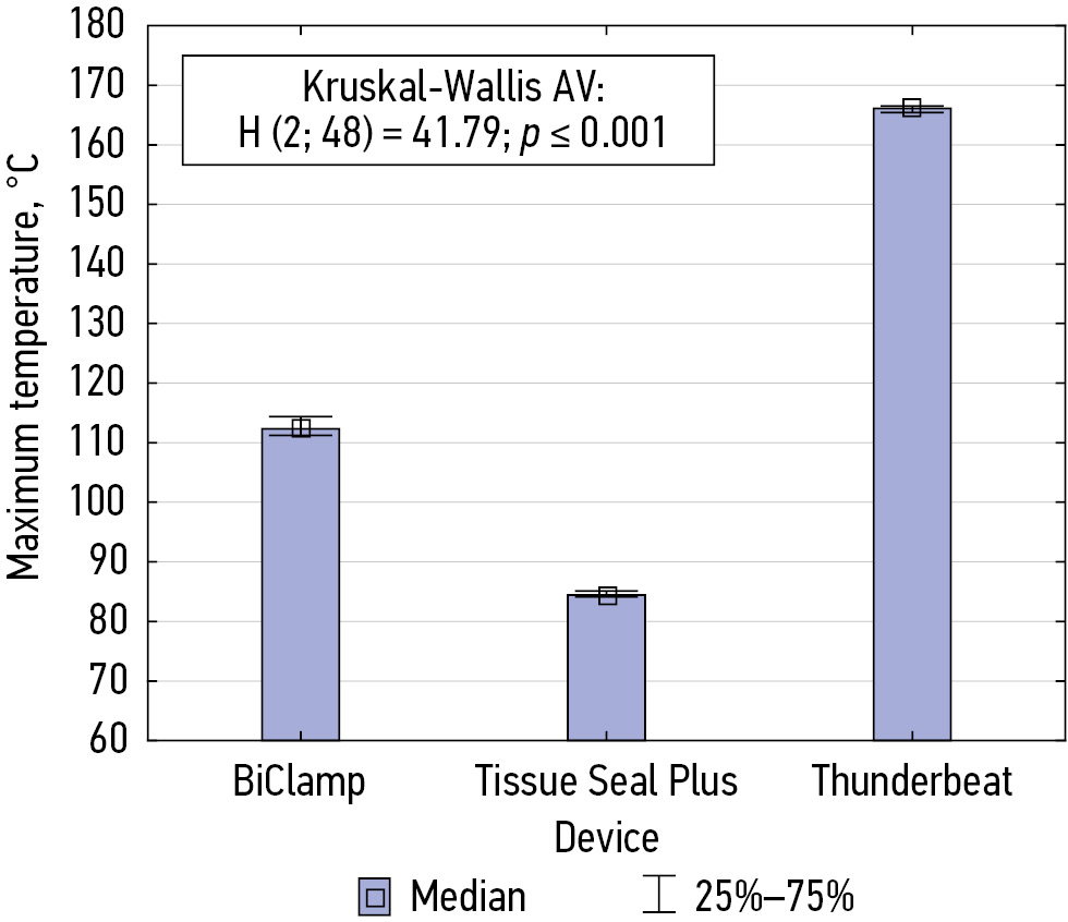 The present study was performed to compare the thermal effects of electrosurgical instruments on the myometrium to determine the degree of thermal damage as well as to determine the effective and safe clinical use of various bipolar instruments. Surgeons determine the degree of thermal tissue damage by assessing tissue appearance, discoloration, and other signs; however, they cannot accurately estimate the depth range of thermal tissue damage. Injuries can be caused by direct exposure to heat or lateral heat propagation. This study aimed to investigate the possible differences between bipolar instruments in vaginal hysterectomy, namely the efficiency of hemostasis and the lateral tissue damage. This study demonstrates that the Tissue Seal Plus® bipolar clamps offer a number of key advantages over the BiClamp® and Thunderbeat® bipolar clamps for electrosurgical hemostasis during vaginal hysterectomy. Thus, the maximum tissue temperature between the jaws during coagulation using the BiClamp® clamp was 112.29°C, and at the coagulation border, this temperature was 71.78°C. The minimum temperature when using the BiClamp was 36.13°C. During coagulation using the Thunderbeat® clamps, the tissue temperature between the jaws was 166.11°C and at the coagulation border was 54.57°C. The minimum tissue temperature when using the Thunderbeat® clamps was 39.60°C. When coagulating using a Tissue Seal clamp, the temperature of the tissue between the jaws was 84.45°C and at the coagulation border was 47.70°C. The minimum temperature with the Tissue Seal Plus Comfort clamps was 35.62°C (p < 0.001). Thus, the maximum tissue temperature between the instrument jaws during coagulation, the minimum tissue temperature, and the tissue temperature at the border were significantly lower when using Tissue Seal Plus® clamps than when using BiClamp® and Thunderbeat® clamps (H value: 41.8, p ≤ 0.01). The tissue temperature at the coagulation border was also statistically significantly lower when using Tissue Seal Plus® than when using other clamps (H value: 41.8, p ≤ 0.001). The temperature values measured by the thermal imager are presented in Table 1.