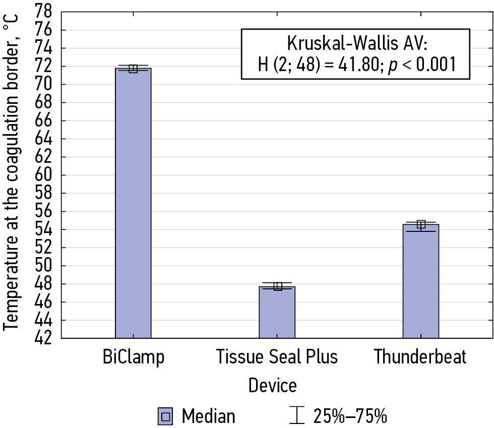 RESULTS: The maximum tissue temperature between the branches on electroligation, the minimum tissue temperature, and the tissue temperature at the coagulation boundary were significantly lower when using a TissueSeal PLUS COMFORT® clamp than when using BiClamp® and Thunderbeat® clamps (H value = 41.8, p ≤ 0.01). Morphometric parameters (prevalence, coagulation depth and area) were the smallest with a TissueSeal PLUS COMFORT® clamp compared to other clamps.