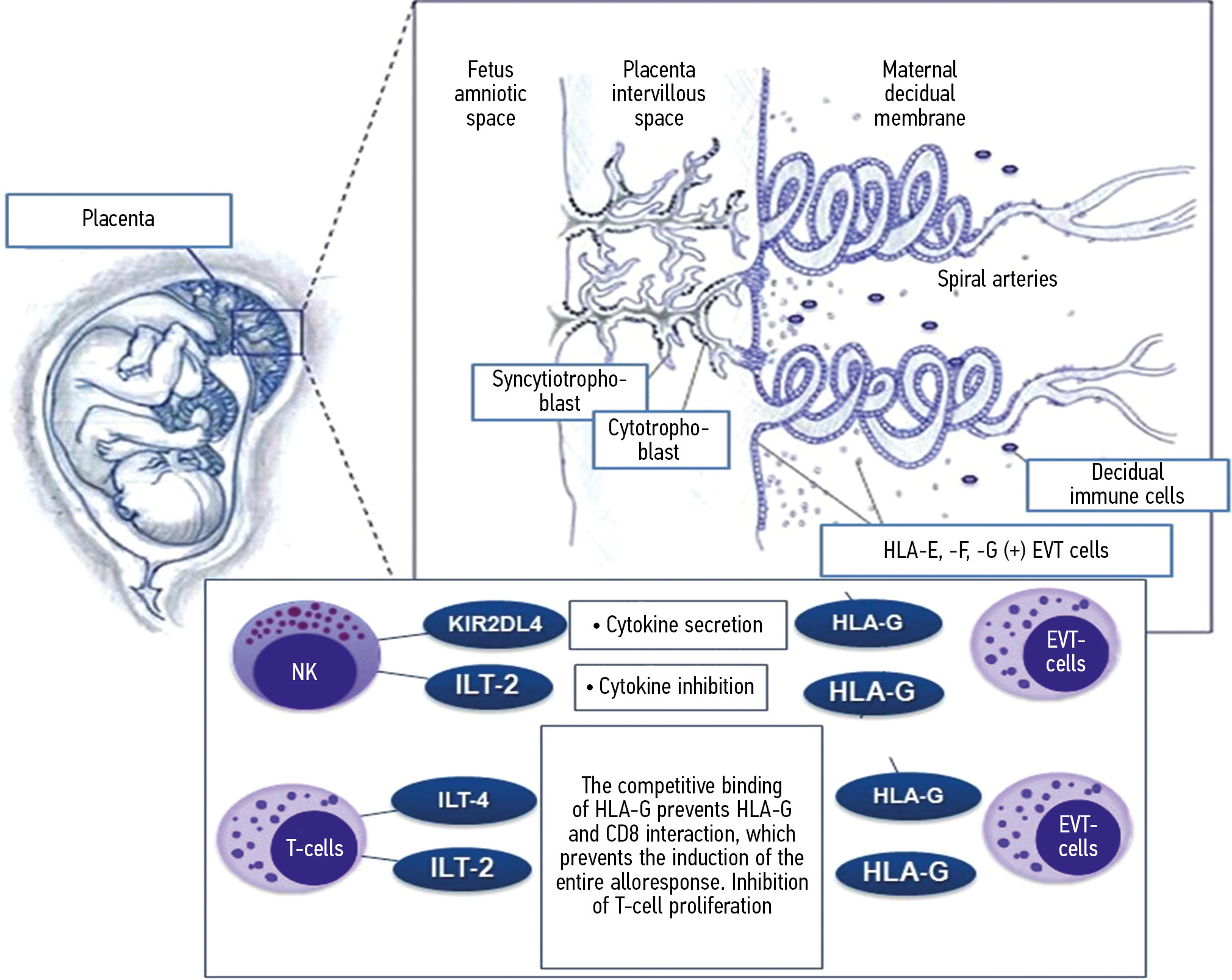 An increased number of infertile couples with a history of miscarriage, including repeated fetal loss, is an unfavorable background in the demographic Russian Federation presentation. Immunological factors in 50%–80% of cases were the main causes of early reproductive losses. Regardless of the gestational age, a unique combination of human leucocyte antigen (HLA) expression on extravillous trophoblast (EVT) cells and maternal leukocytes in decidual tissue at the border of the mother–placenta–fetus system is observed. Cells of the EVT express polymorphic nonclassical class I human major histocompatibility complex antigens HLA-E, HLA-F, HLA-G, and HLA-C (Fig. 1). HLA-G represents a molecule that protects the fetus from destruction by its mother’s immune system, thus greatly contributing to the tolerance of the two organisms.