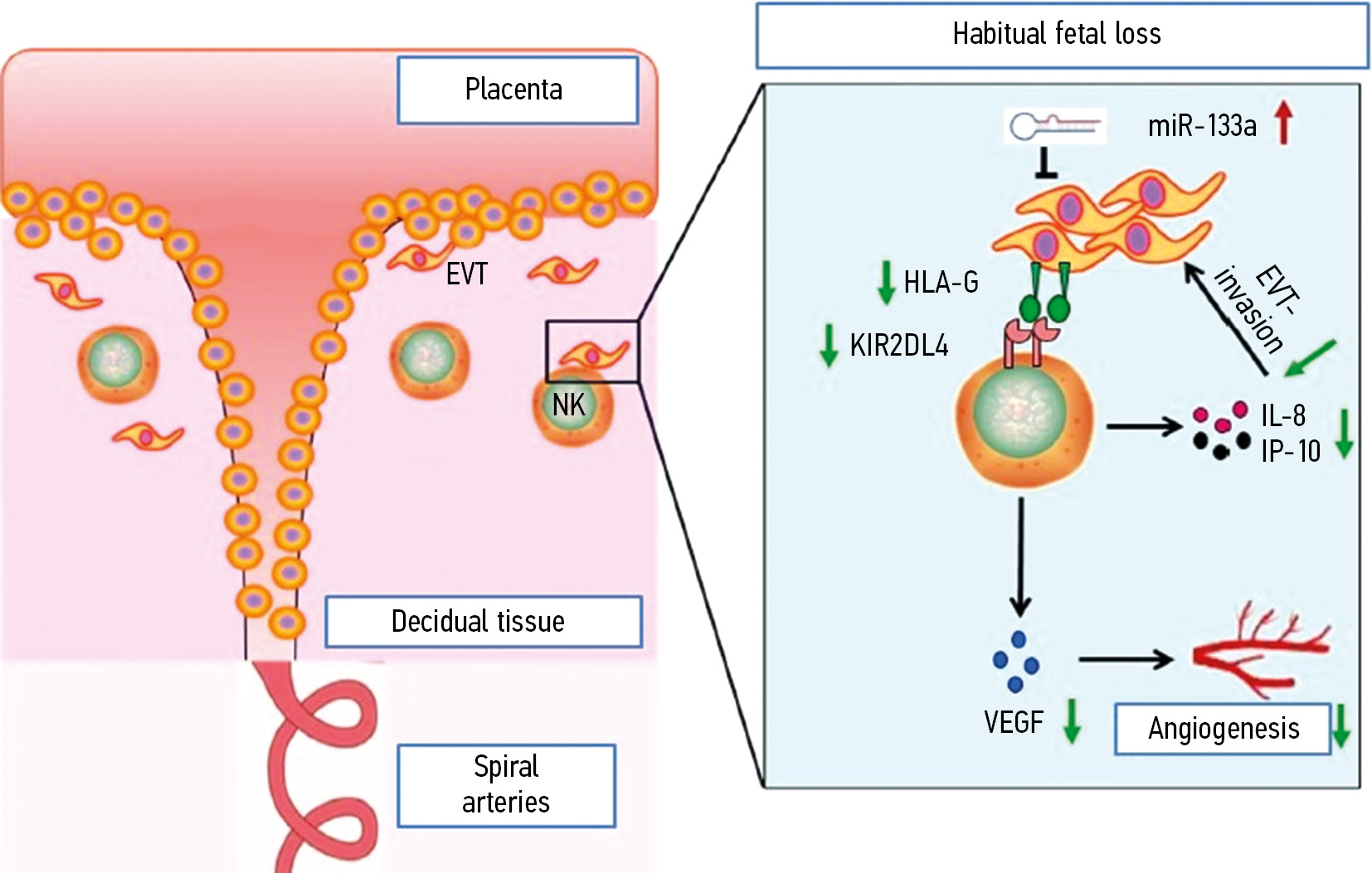 Fig. 2. Scheme illustrating the hypothesis of the relationship between a decreased HLA-G gene expression and dysfunction of decidual natural killer (NK) dysfunction in recurrent miscarriage (recurrent fetal loss). Lower KIR2DL4 expression in decidual NK cells in patients with recurrent miscarriage may suppress the proinvasion and secretion of pro-angiogenic cytokines in these cells. Additionally, reduced HLA-G gene expression by miRNA-133a in the trophoblast cell line, HTR-8/SVneo, may affect the secretion capacity of decidual NK cells when bound to KIR2DL4. Decreased levels of cytokines may affect trophoblast invasion and angiogenesis. EVT — extravillous trophoblast cells; VEGF — vascular endothelial growth factor [23]