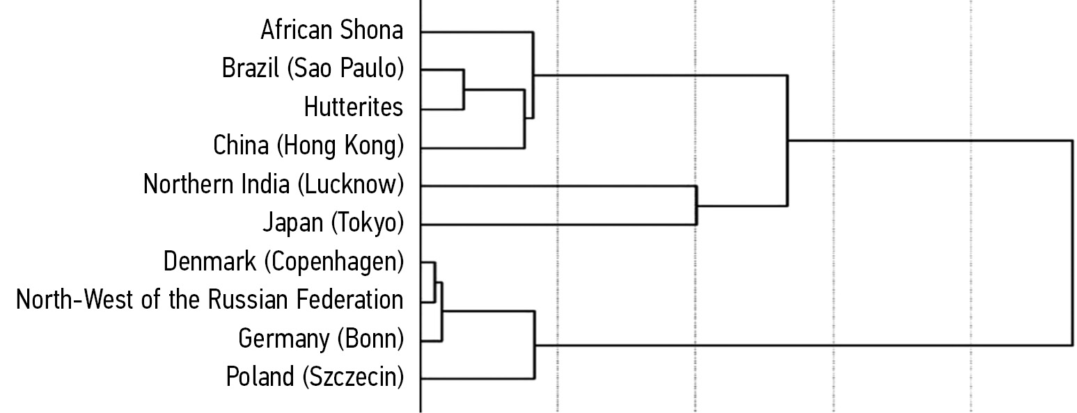Fig. 3. The similarity of different populations for the G*0101–0107 alleles of the HLA-G gene. Clustering by Ward’s method using the Euclid distance measure [25]