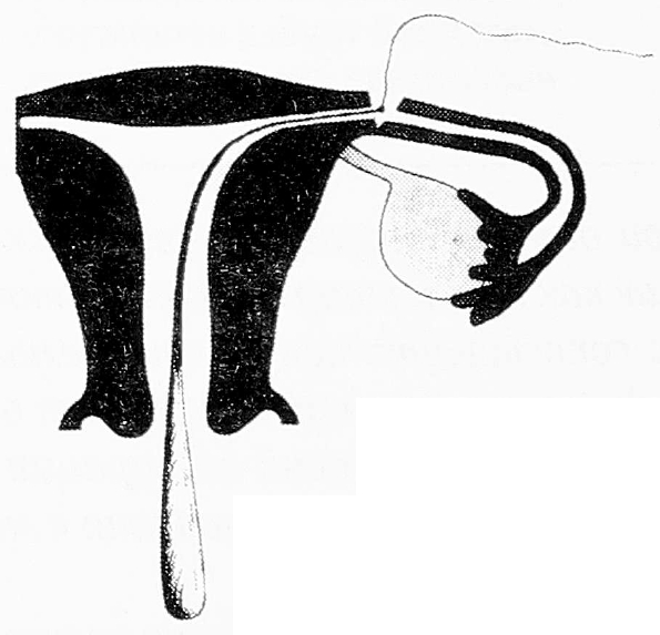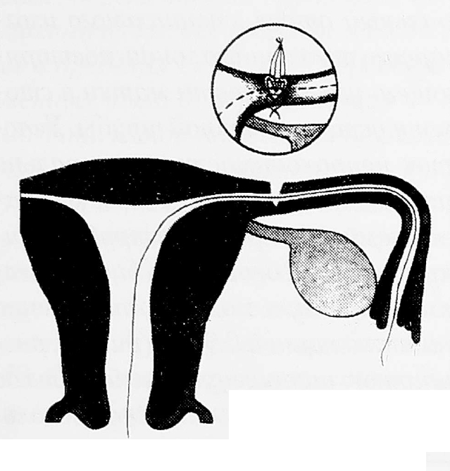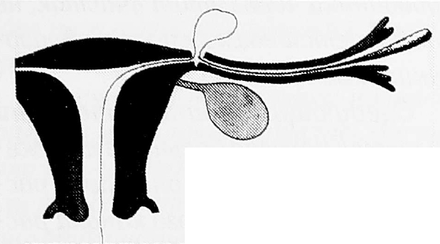 Рис. 2. Нить-протектор проведена через интрамуральный отдел маточной трубы, матку и влагалище, второй конец нити привязан к носику зонда, проведенного через фимбриальный конец маточной трубы.