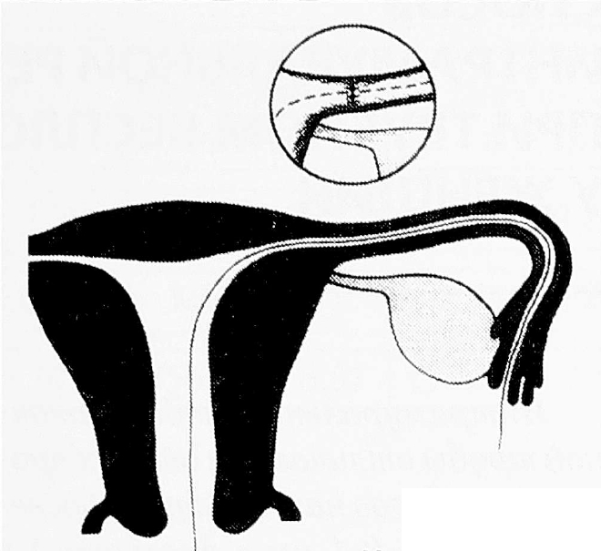 Вследствие этого единственным хирургическим способом ликвидации интрамуральной окклюзии до настоящего времени считается утеротубарная имплантация, при которой указанный участок либо иссекается, либо обходится [ 1, 2, 3, 4, 5]. В литературе описаны и в практической деятельности хирургов применяются различные варианты утеротубарной имплантации, которые характеризуются достаточно высокой травматичностью и сравнительно малым процентом восстановления проходимости интрамурального отдела и возникновения беременности. В связи с этим, нами предложен новый способ реканализации интрамурального отдела маточной трубы.