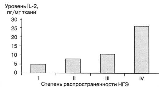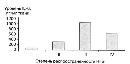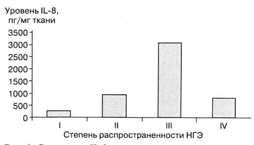 Подобная динамика отмечена и для IL-8. Уровень IL-8 зависел от степени распространенности НГЭ и составил при: