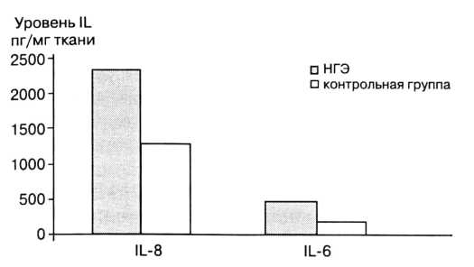 В то же время при сравнении содержания IL-2 и IL-8 в ПЖ больных НГЭ с показателями контрольной группы, достоверных отличий получено не было.