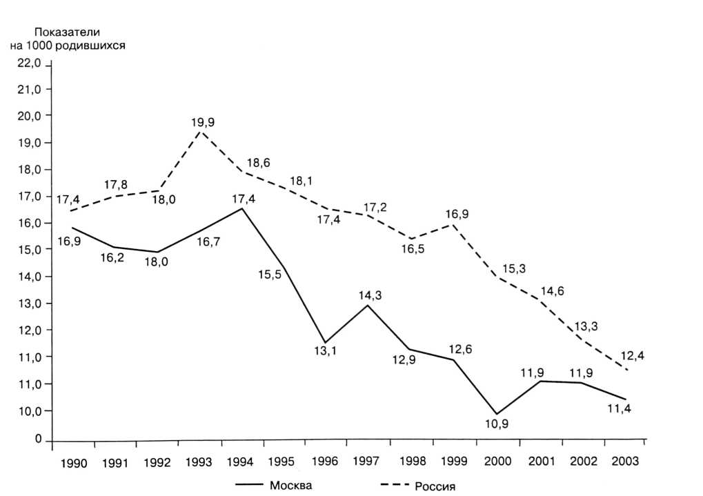 По России в целом уровень младенческой смертности, по сравнению с началом 90-х годов прошлого столетия, значительно снизился, но продолжает регистрироваться на высоких показателях (12,4 на 1000 родившихся в 2003 году). На рис. 2 приведены показатели младенческой смертности в РФ по сравнению с Москвой.