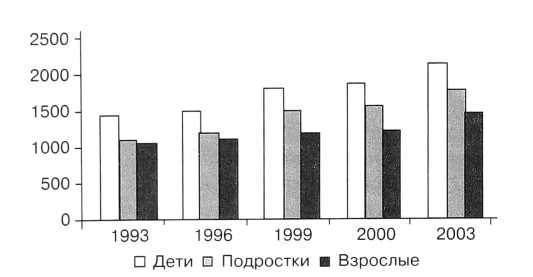 Особенностью для России является то, что на фоне низкой рождаемости продолжается ухудшение здоровья взрослого и детского населения. На рис. 4 представлена общая заболеваемость населения по возрастам. Наиболее угрожающий характер заболеваемости отмечается в группах детей от 0 до 14 лет.
