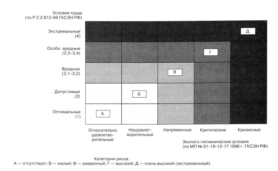 Для интегральной оценки комплексного воздействия среды проживания и условий труда разработана шкала Денисова Э.И. (рис. 6), с помощью которой возможно определить рост категории риска для репродуктивного здоровья в зависимости от повышения вредности условий труда и степени экологического неблагополучия места проживания.