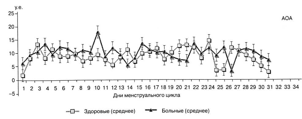 Известно, что в нормально функционирующих клетках регистрируется достаточно низкая активность процессов пероксидации липидов, что свидетельствует о наличии защитной системы, включающей ферментативное и неферментативное звенья АОЗ, а ряд гормонов, в том числе и половые стероиды, участвуют в регуляции процессов СРО [2]. В то же время анализ литературных данных не дает необходимого представления о динамике основных антиоксидантов у больных с диффузной мастопатией на протяжении менструального цикла.