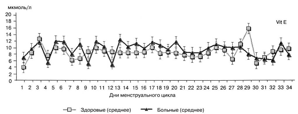 При динамическом определении уровня токоферола (рис. 2) нами отмечено его периодическое снижение у пациенток с мастопатией, как в первой половине цикла (на 9-й и 12-й дни), так и в конце цикла (на 29-й день) (все р < 0,05).