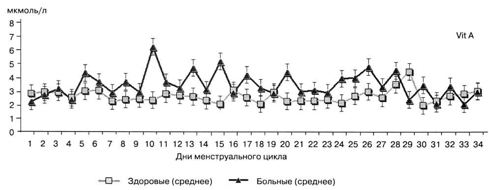 Рис. 3. Концентрация ретинола в плазме крови здоровых женщин и больных с мастопатией в динамике менструального цикла