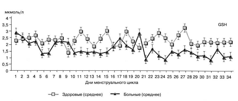Рис. 4. Концентрация восстановленного глютатиона в динамике менструального цикла у больных с диффузной мастопатией и здоровых женщин