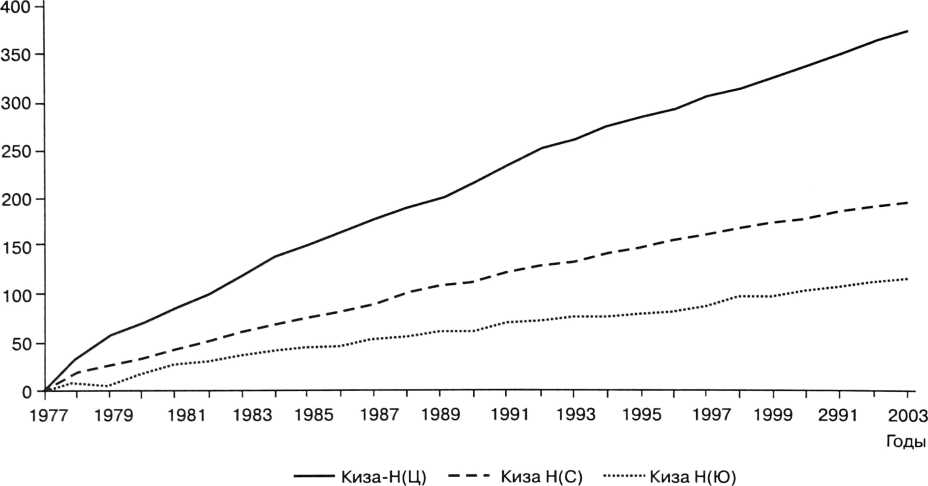 Наименьшая частота нарушений соматического, репродуктивного здоровья выявлена у жительниц нашего региона I поколения, рожавших в 1978 году. У них эффект накопленного неблагоприятного воздействия комплекса ксенобиотиков был минимальным (12 лет). Накопленный комплексный индекс загрязнения атмосферы (КИЗА-Н) составил 30. Наибольший рост патологии соматического и репродуктивного здоровья выявлен у жительниц нашего региона в начале 2000-х годов, когда длительность эффекта накопленного действия химических веществ составила более 35 лет. КИЗА-Н при этом вырос в районах обследования почти в 10 раз (рис. 1).