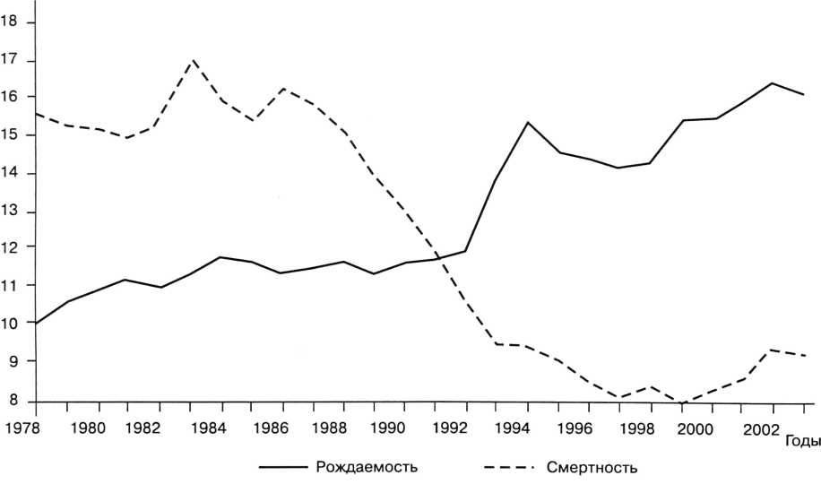 Были выявлены основные тенденции деформации здоровья женской и детской популяций (рис. 2). Это резкое снижение рождаемости и увеличение смертности; диспропорция полов в сторону увеличения числа женщин; снижение возрастной интенсивности деторождения за счет уменьшения количества девочек до 15 лет на 6,4% и женщин активного репродуктивного возраста (20-29 лет) на 18,7% на фоне увеличения числа женщин пострепродуктивного возраста; уменьшение числа зарегистрированных браков, рост разводов (в начале 2000-х годов на 1,5 брака приходился 1 развод); большое количество абортов, в 2 раза превышающее число родов; формирование нового типа репродуктивного поведения населения с ориентацией на однодетную семью и достаточно быстрое завершение генеративной функции к 30-ти годам. Выявлены глубокие нарушения адаптационного гомеостата, проявляющиеся в «омоложении» смертности среди женского населения младшего и среднего репродуктивного возраста за счет увеличения смертности юных (15—19 лет) и молодых женщин (20-35 лет); смертность в этих возрастных группах женщин возросла в 2003 году по сравнению с 1980 годом в 2 раза (рис. 3, 4).