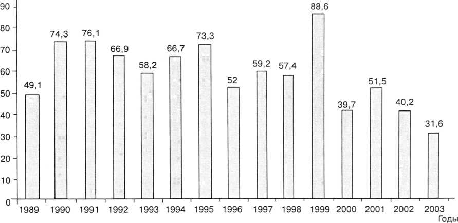 Рис.З. Динамика материнской смертности в Волгоградской области (на 100 000 живорожденных)
