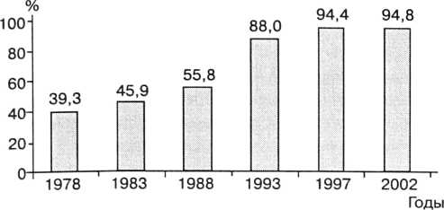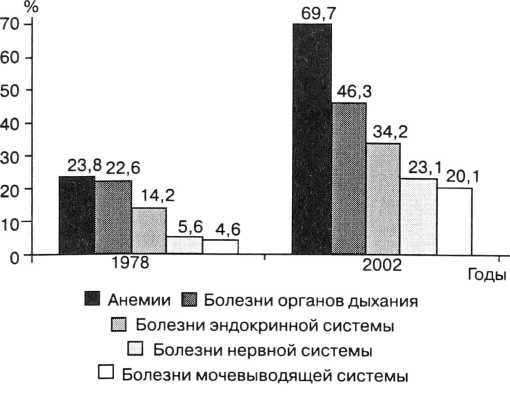 Наши собственные исследования показали следующее. За 25 лет наблюдения здоровье беременных женщин в регионе значительно ухудшилось (рис. 5). Частота экстрагенитальной патологии увеличилась в 2,5 раза (с 39,3 до 94,8%). В наибольшей степени возросли (рис. 6) анемии (69,7%), болезни органов дыхания (46,3%), эндокринной (34,2%), нервной (23,1%) и мочевыделительной систем (20,1%). Наибольшая частота их была в г. Волжском, как наиболее экологически неблагополучном.