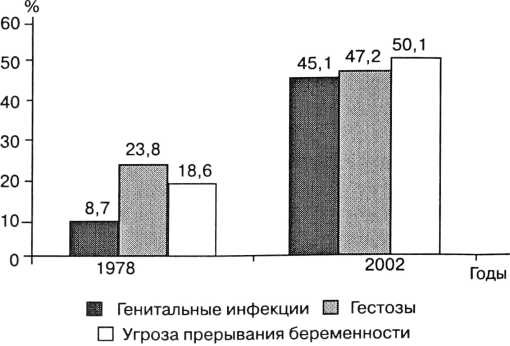 Полученные данные превышают популяционные показатели почти на 50%, что свидетельствует о нарушениях в биосистеме «мать», которая изначально не в состоянии обеспечивать оптимальные условия развития плода. На этом фоне за 25 лет в 2,4 раза увеличилась частота осложнений беременности (рис. 7). Частота угрозы прерывания беременности увеличилась почти в 3 раза (50,1%), гестозов в 2 раза (47,2%), генитальных инфекций — в 5 раз (45,1%). У каждой беременной регистрировалось не менее 3-х видов патологии. Наибольшая частота акушерских осложнений выявлена в г. Волжском.