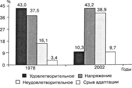 Выявлено нарушение процессов адаптации в виде неудовлетворительной адаптации и срыва ее у 48,6% беременных в начале 2000-х годов. В конце 70-х годов прошлого столетия таких беременных было всего 19,5%.