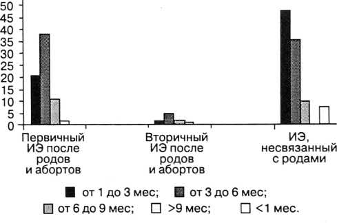 У 82 женщин (13%) ИЭ развился после родов и абортов: из них у 71% в послеродовом периоде и у 29% в послеабортном периоде. Наиболее часто встречающейся формой ИЭ в исследуемой группе женщин в послеродовом и послеабортном периодах явился первичный ИЭ — 88% и только у 12% — вторичный ИЭ.