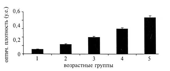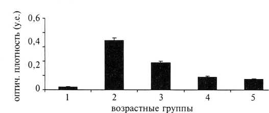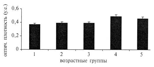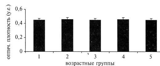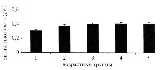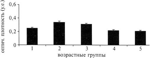 Оптическая плотность мелатонина достигает максимального значения во 2—й группе (0,34±0,01 у.е.), у женщин старше 36 лет (4 и 5—я группы) наблюдается достоверное снижение этого показателя (р<0,05) (рис. 2).