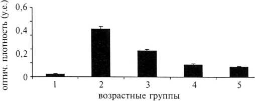 Межгрупповых различий в значениях оптической плотности Мс1—1 нами не выявлено (рис. 13), однако была показана положительная корреляция между значениями оптической плотности и возрастом беременных (к=0,27).