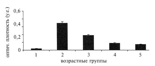 Рис. 5. Оптическая плотность экспрессии CD34 в плацентах беременных различных возрастных групп