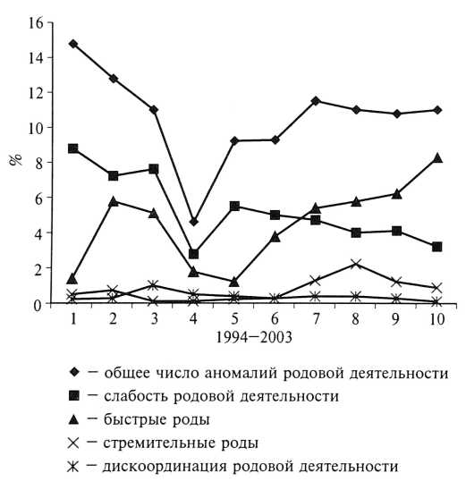 - В последнее время на фоне относительной стабилизации общего числа родов, осложненных аномалиями родовой деятельности (10—12 %), происходит изменение структуры выявленной патологии. Так, в частности, на фоне некоторого снижения частоты выявления видов аномалий родовой деятельности, при которых наблюдается замедленное продвижение предлежащей части плода и раскрытие шейки матки, достоверно в процентном отношении возрастает число аномалий, для которых характерно ускорение раскрытия шейки матки и быстрое продвижение плода по родовому каналу.