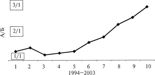 Например, в период с 1994 по 1997 год отмечалось прогрессивное снижение частоты выявления слабости родовой деятельности, быстрых и стремительных родов на фоне незначительных колебаний частоты выявления ДРД, но в период с 1998 по 2003 год выявлена иная картина. На фоне возрастания общего числа всех аномалий родовой деятельности, обусловленного быстро возрастающим числом быстрых и стремительных родов, отмечалось прогрессирующее снижение частоты выявляемоcти слабости родовой деятельности и ДРД. На рис. 2 демонстрируется динамика отношения гиперэргических вариантов аномалий родовой деятельности к гипоэргическим (быстрые и стремительные роды/слабость и ДРД).