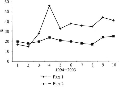 Возрастание величины этого отношения в пользу гиперэргических вариантов буквально по экспоненте не может быть случайным явлением, а, скорее всего, связано с внедрением «активных» методов ведения родов. Если снижение частоты выявления ДРД до 0,12 % в 2003 году как—то можно связать с трудностями диагностики, с реальным пониманием неопределенности представления о патогенетической сути ДРД, то прогрессирующее снижение частоты выявления слабости родовой деятельности можно связать только с ятрогенными причинами. Связь динамики изучаемых показателей с некоторыми параметрами, характеризующими исходы родов, отражена в таблице. Если судить по среднестатистическим данным, характерным для пятилетних периодов (1994—1998 и 1999—2003 годы), то инверсия частоты выявляемости видов аномалий никак не отразилась на частоте абдоминального родоразрешения и несколько снизила частоту нередуцированной перинатальной смертности. Однако при углубленном анализе исхода родов в группе аномалий родовой деятельности, связанных с замедлением раскрытия шейки матки (слабость, ДРД), установлено, что при тенденции к достоверному снижению частоты выявления этих видов аномалий частота абдоминального родоразрешения остается высокой (рис. 3).