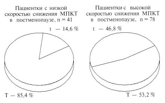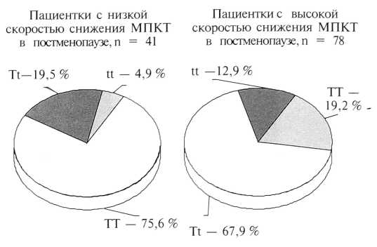 Число женщин с медленной потерей МПКТ, имеющих генотип tt, составило 4,9 % и было заметно меньше таковых в популяции (7,7 %), в то время как частота функционально неполноценного генотипа tt среди женщин с быстрой потерей МПКТ достигала 12,9 % (рис. 1).