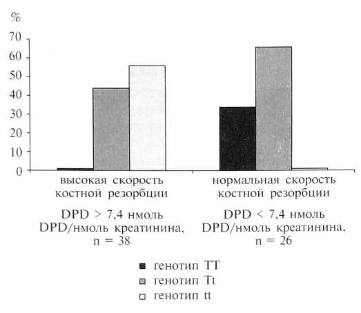 Таким образом, женщины с генотипом tt имеют абсолютный риск попадания в группу с высокой скоростью потери костной массы по данным DPD—теста.