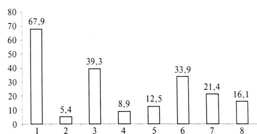 Пациентки с ВРВМ имели рост от 158 до 17 см (в среднем 163,8±0,4 см) и массу тела от 50 до 82 кг (в среднем 62,7±0,9). Средний индекс массы тела составил 23,4±0,3. При осмотре нижних конечностей у 34 (60,7 %) пациенток обращало на себя внимание наличие в области голеней и бедер расширенных вен или «сосудистых звездочек». Характер жалоб пациенток с ВРВМ представлен на диаграмме (рис. 1).