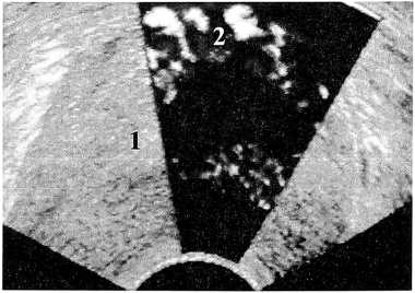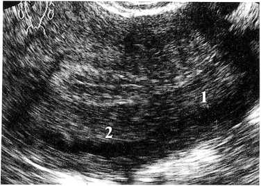 Рис. 4. Больная Т., 38 лет, 8 день менструального цикла. Диффузные мышечные изменения в миометрии. Продольное ТВ—сканирование, ЭД: 1 — миометрий; 2 — дилатированные вены миометрия