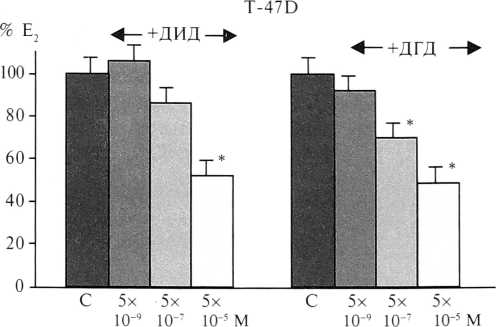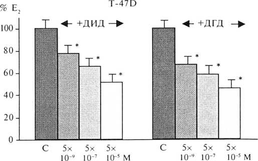 Преконфлюэнтные клетки T—47D инкубировались в течение 24 часов при 37 °C только с эстрон сульфатом в физиологической концентрации ([3H]—E1S:5х10—9 моль\л) (контроль — необработанные клетки) или в присутствии дидрогестерона или его 20—дигидро—метаболита в диапазоне концентраций от 5x10—9 до 5x10—5 моль\л. Концентрация эстрадиола определялась после разделения гормонов, как показано в «Материалах и методах». Процент влияния (в фмоль Е2/мг ДНК, образовавшегося из Е1S) был рассчитан посредством отношения: [(тест—контроль)/контроль]х100. Представлены средние значения данных±СОС в 2—х независимых дублирующих определениях. * — р ≤ 0,05 по сравнению с контрольными данными