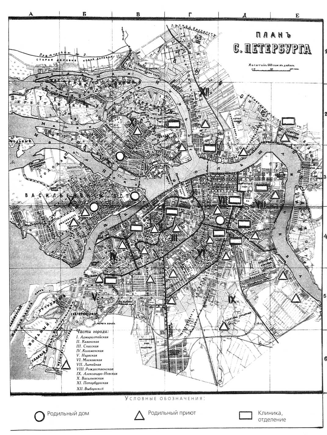 К 1917 году в Петрограде (официальное название с 1914 по 1924 год) насчитывалось около 300 лечебных заведений. По данным литературных источников, акушерскую помощь оказывали примерно 39 из них [1, 2, 5—8]. Сеть родовспомогательных учреждений наглядно показана на плане Санкт—Петербурга (рис. 1). В работе использован план города на 1899 год [11], который отражает существовавшее с середины XIX века по февраль 1917 года территориальное деление Санкт—Петербурга на 12 частей и 7 участков [12]. При определении месторасположения заведений на плане использовался справочник—указатель по топонимике города [9].